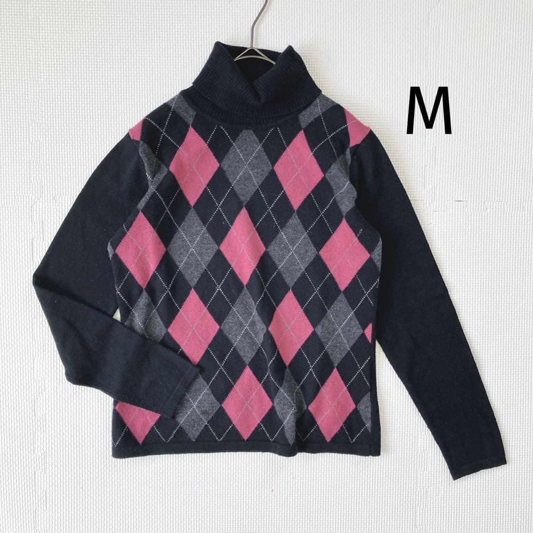 - アーガイル柄 タートルネック ニット【M】ピンク ブラック グレー