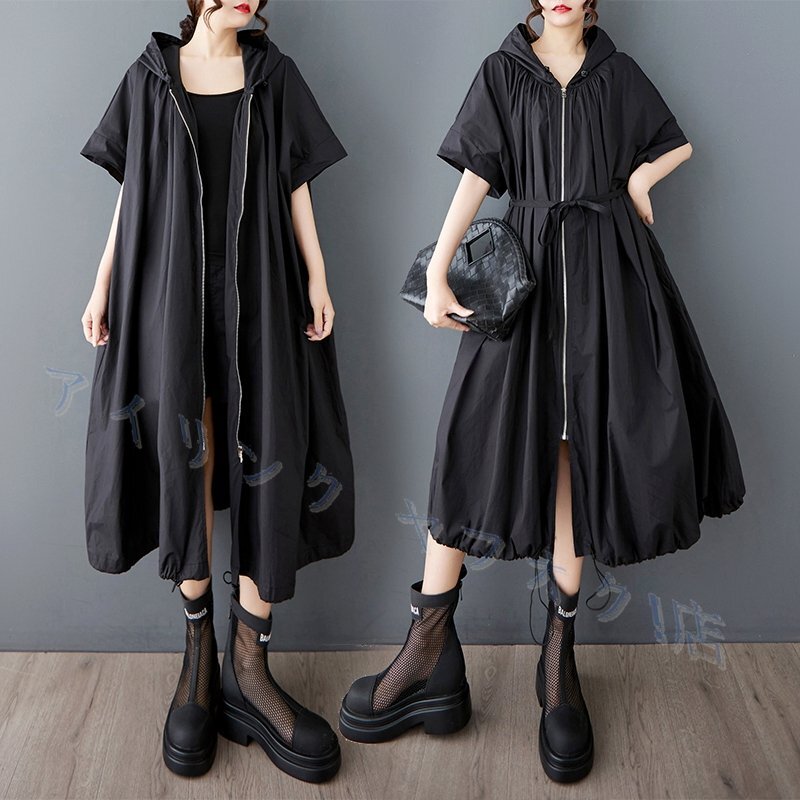- 新品★夏 カジュアル 20304050代 ゆったり大きいサイズ フード付きロングワンピースコート半袖 黒
