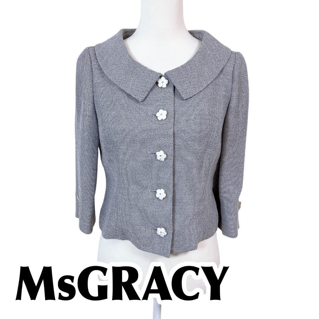 - 【美品】エムズグレイシー 麻混 リネン 春夏ジャケット 38 花柄ボタン グレー