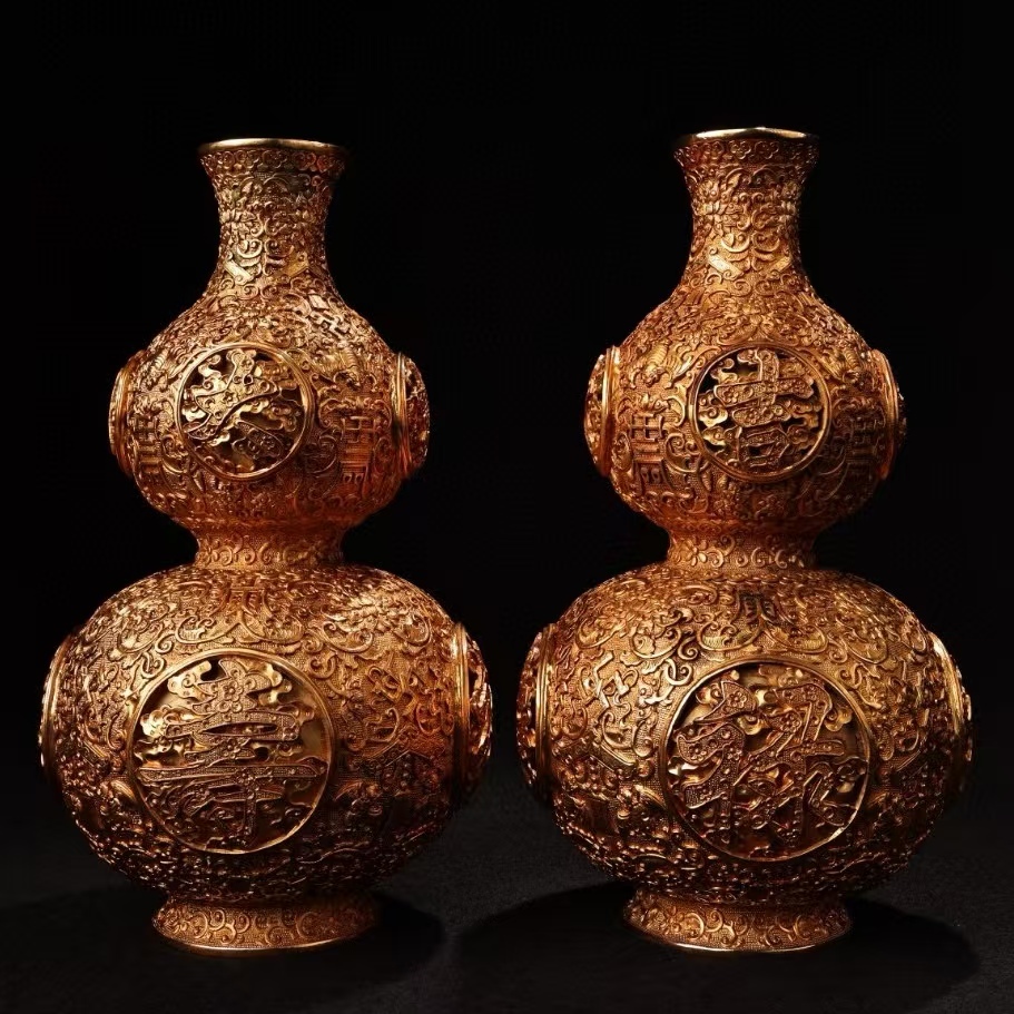 > 清代 乾隆年制 葫芦 旧蔵 チベット古寺 古銅金宮廷御蔵福禄寿喜宝瓢箪花瓶ペア 銅製 銅琉金 唐物 收蔵品 時代物 供養品 古置物 仏教6.26
