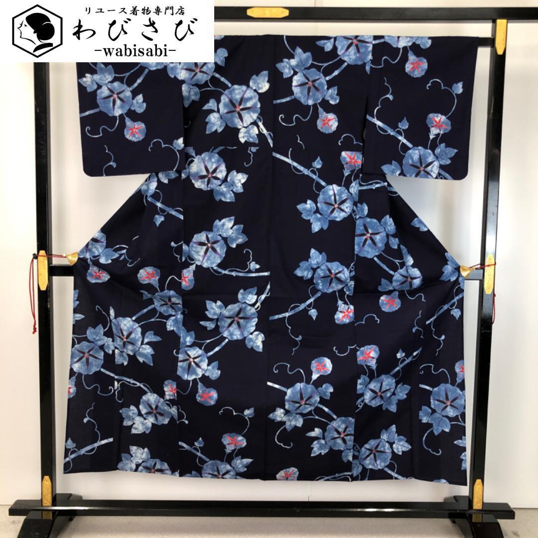 青褐色のお色味に朝顔の柄裄がデザインされた素敵なお品でございます。