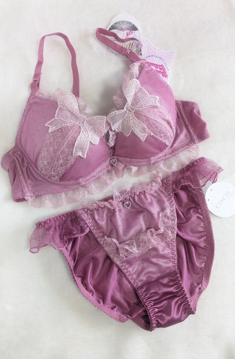 > お泊まりに☆C70ブラ&パンティ上下お揃い☆未使用☆可愛いリボンレース&ふんわりプチフリル☆ピンク☆匿名配送可☆タグあり☆