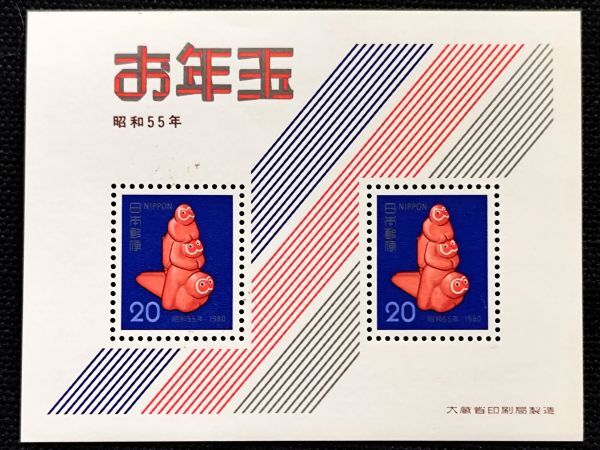 - [25062819] 年賀切手【お年玉小型シート 昭和55年】 申・さる「喜々猿」ききざる 湊焼 20円×2 1980年発行