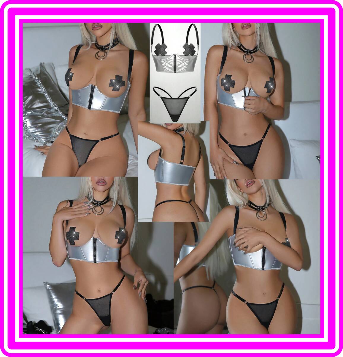 > ★超素敵★エナメル★シルバー★オープンデザイン★ランジェリーセット★アンダーワイヤー★Tバック★ボーン入★フロントジッパー★P184