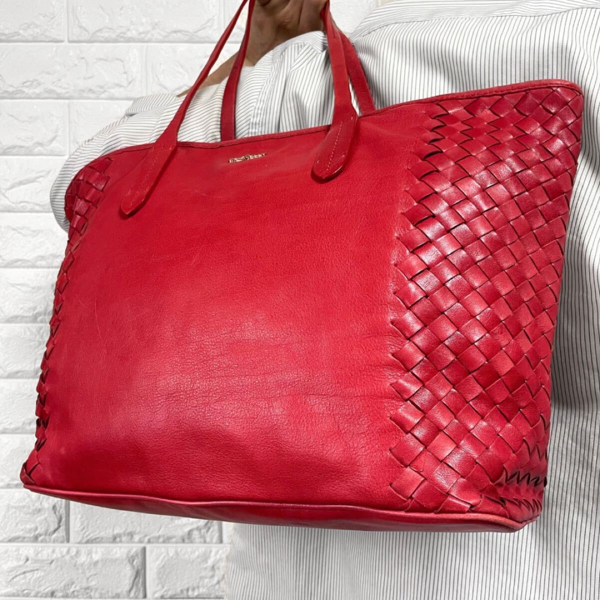 - コールハーン COLE HAAN ビジネス トートバッグ 肩掛け イントレチャート 編み込み ロゴ金具 レザー レッド系