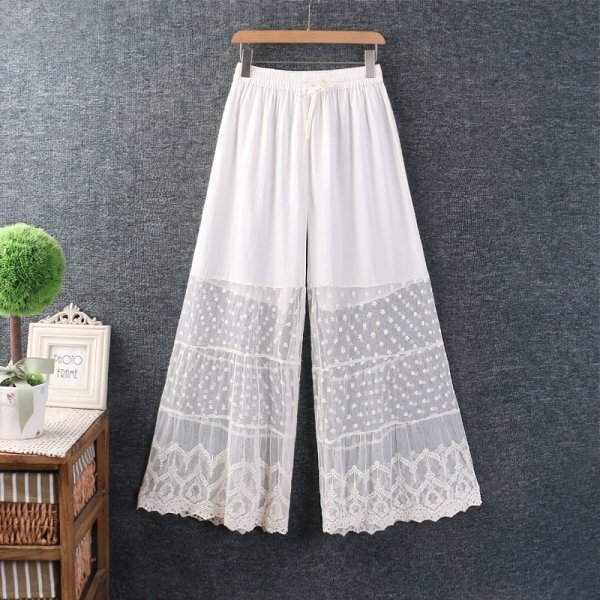 - 2406 透けレース クリーム色系 ぺチパン ズボン 綿100% ガウチョパンツ ナチュラル系 大人可愛 重ね着風