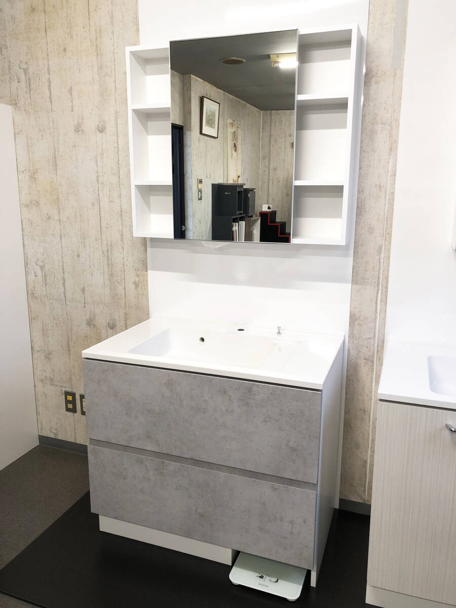 - ★新品未使用!★90cmオーダー洗面化粧台(コンクリート色扉/人大一体ボール/引出し/上下set)定価268,000円※水栓は無しです。