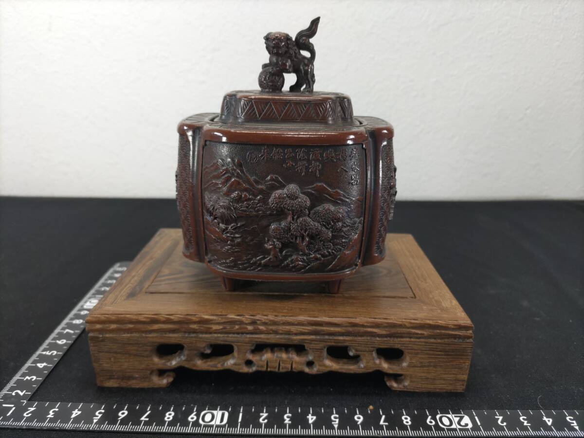> ■送料無料!■玉乗り獅子摘み香炉■宏米・佐野宏采作■高岡銅器■山水・風景図■四足香炉■作家物・伝統工芸品■鉄刀木・花台付き!