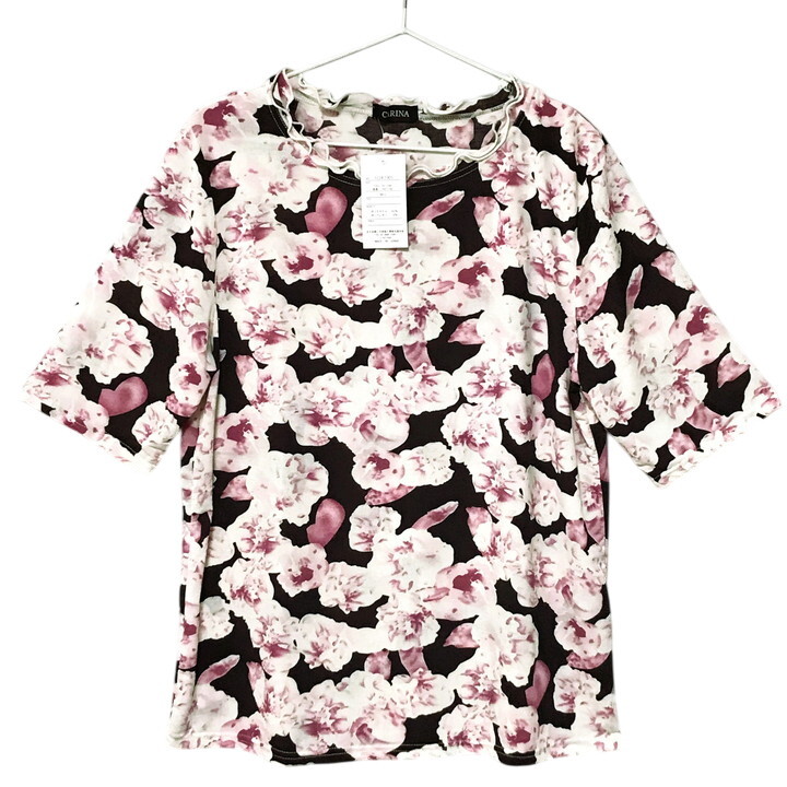 > ■新品■ CARINA フリルネック 花柄 五分袖 カットソー 白 ピンク M L サイズ 薄手 半袖 エレガント カジュアル レディース 婦人 ミセス 72