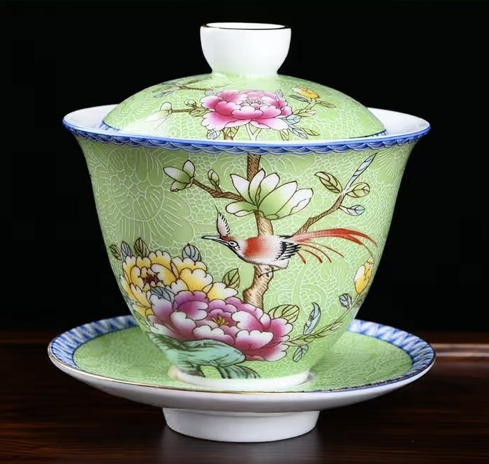 - 蓋碗「鳥語花香」グリーン(中国茶器)磁器・琺瑯蓋碗
