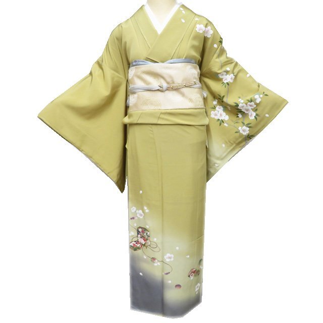 - 訪問着 着物 未使用 正絹 袷 フォーマル 金駒刺繍 花の図 桜 貝合わせ 灰みの黄系色 多色 身丈163cm 裄69.5cm L きもの北條 A1225-9