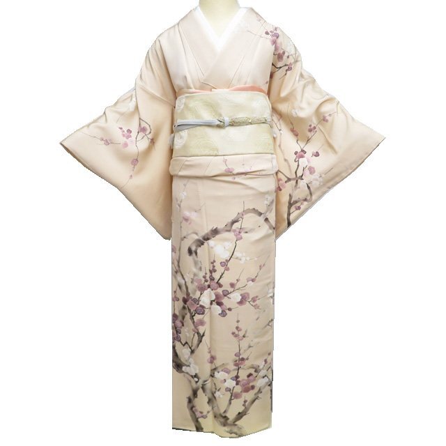 - 訪問着 着物 中古 正絹 袷 フォーマル 紋付き 作家物 落款 花の図 梅 薄橙色 多色 身丈162.5cm 裄64.5cm M きもの北條 A1225-6