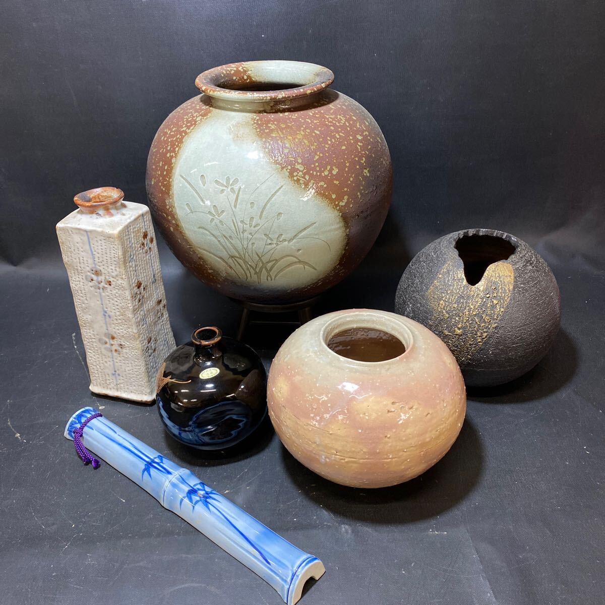 - N 6161 [ 花器 6点 まとめて ] 染付 壁掛け 大型 一輪差し フラワーベース 焼物 陶器製 壺 花生け 花入れ 花活け 茶道具 花瓶 現状品