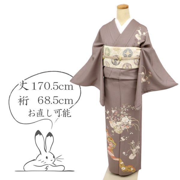 - 【付下げ】 単衣 長尺 道長取りに花籠模様 江戸鼠色 正絹着物 SP5-5