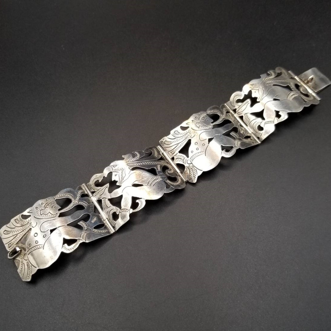 - R&M Guatemala マヤ文明 鷲頭の戦士 パネルチェーン ヴィンテージ ブレスレット 925 シルバー 銀 極幅広 オープンワーク 23-V