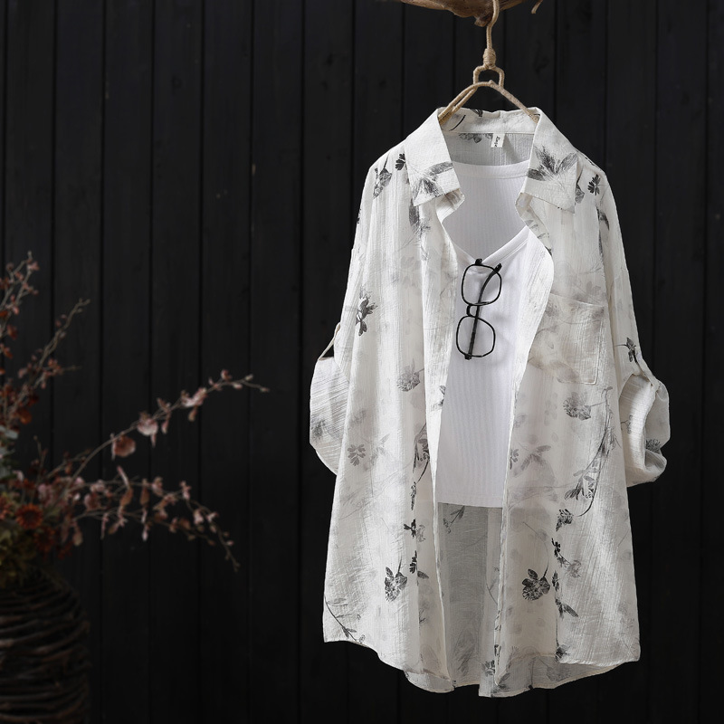 - 新作 チュニック 爽やか花柄 ワイシャツ 大人可愛 ゆったり オシャレ フリーサイズ ナチュラル 綿100% 日焼け防止 タイプ黒