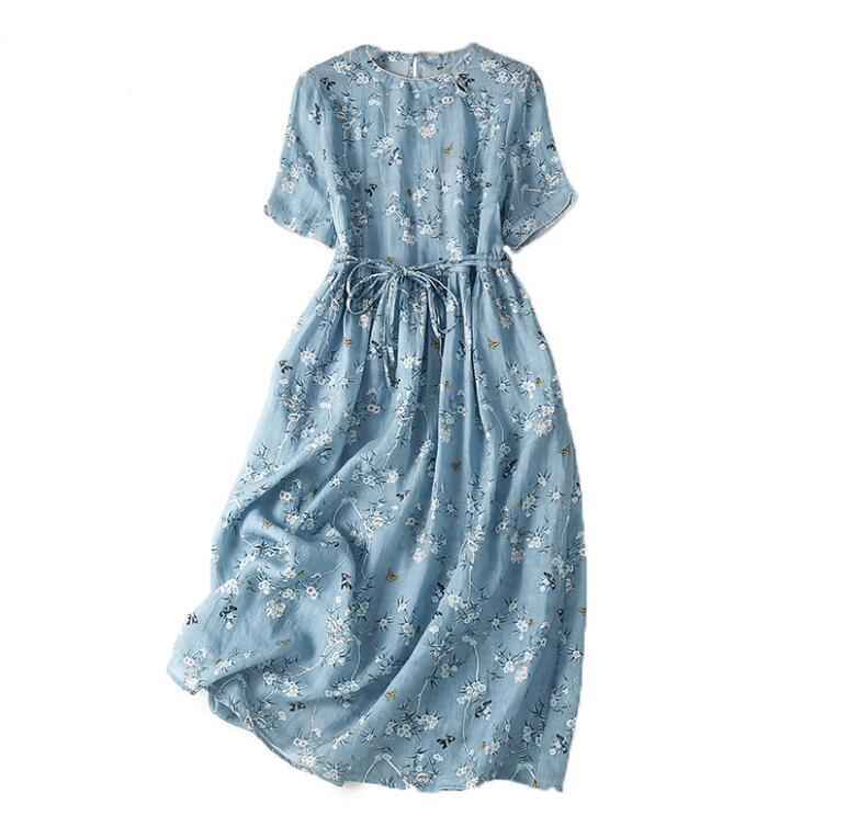 - 新入荷新作エレガントな花柄プリント綿麻ワンピース レディース ワンピース 50代 60代 ファッション ブルー 薄手 夏のお出かけに