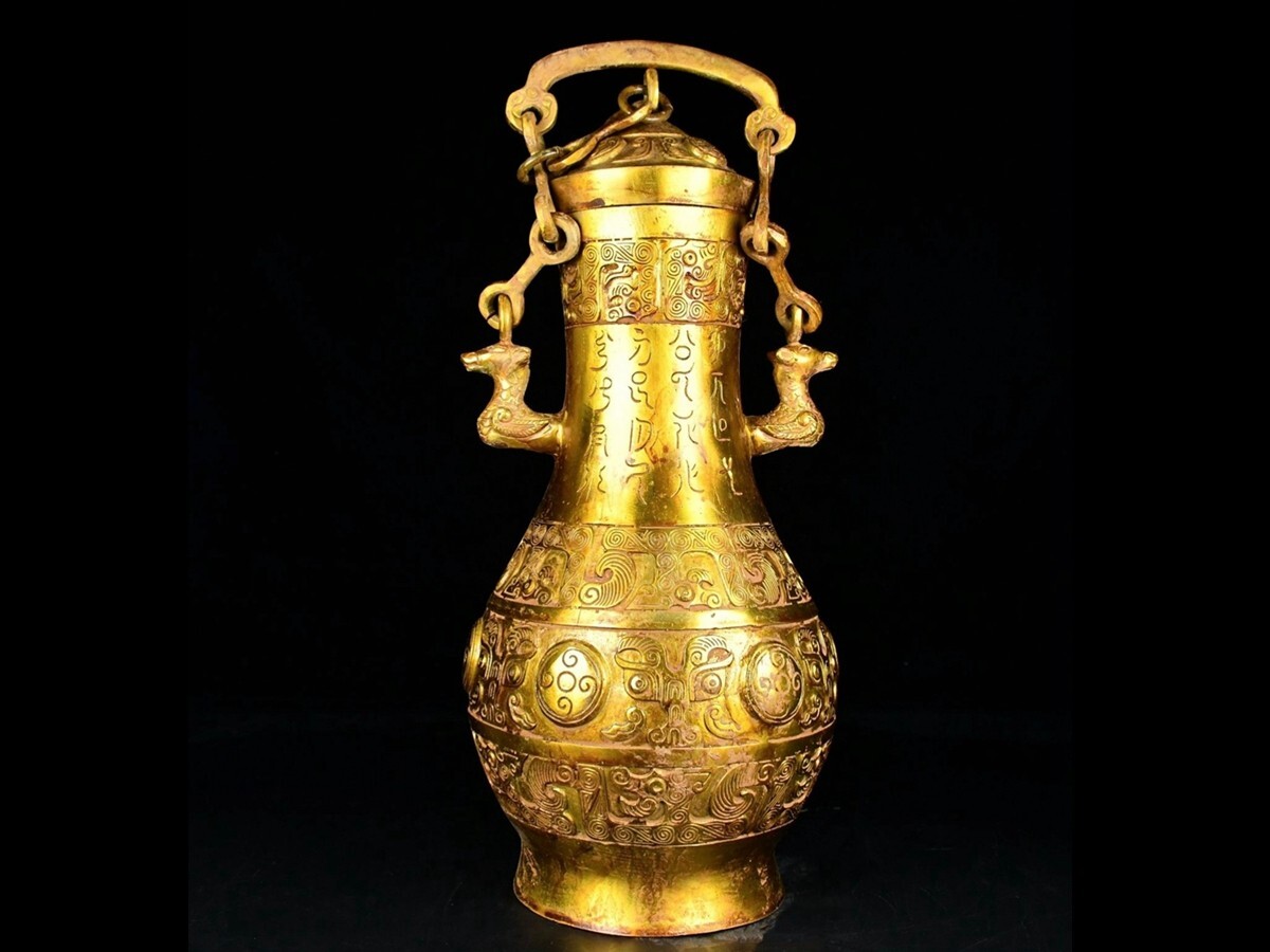- 「戦國時期 青銅器彫 塗金銘文青銅鏈子提梁釉」青銅器 置物擺件 賞物 中国古美術 旧蔵出