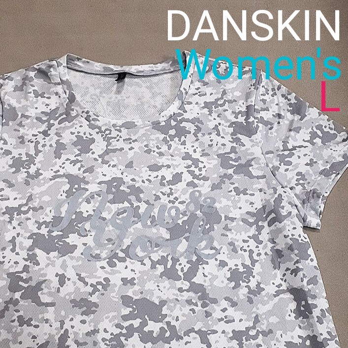 - 【超美品】DANSKIN ダンスキン レディースL Tシャツ スポーツシャツ フィットネス ヨガ ピラティス ダンス ズンバ 総柄 ロゴ
