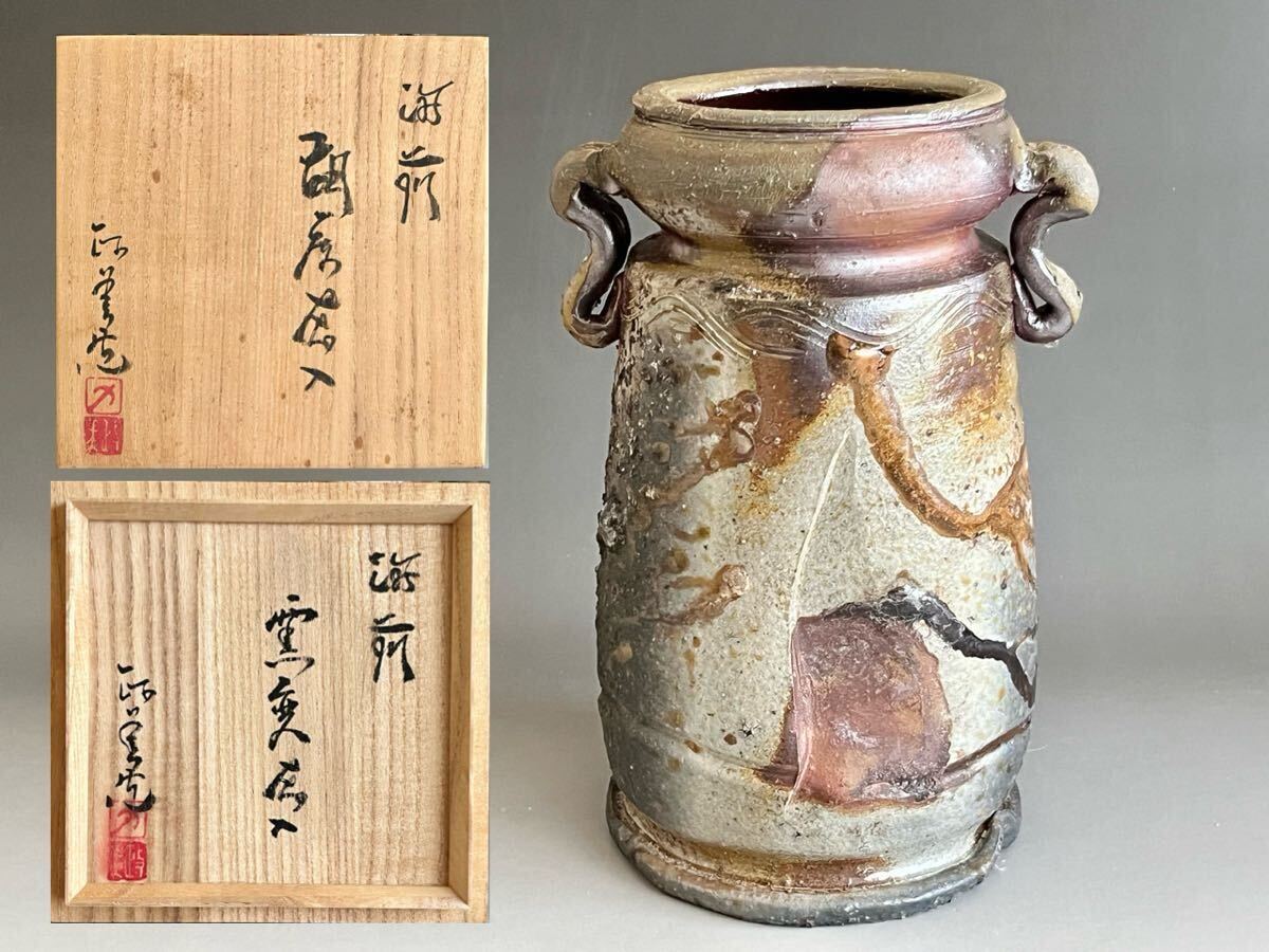 > 西川政美 (師 人間国宝 金重陶陽) 備前 窯変 胡麻 花入 耳付 花生 花瓶 花器 茶道具