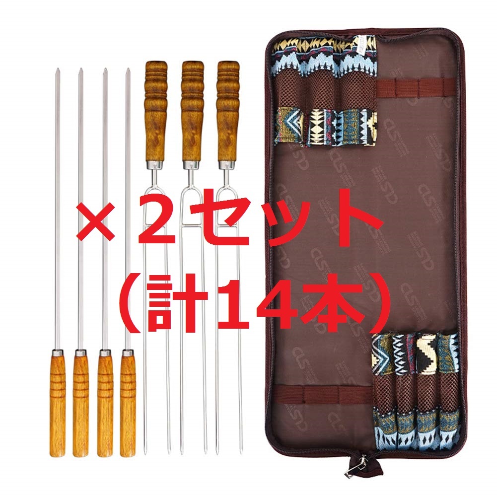 - 新品☆【14本セット+収納ケース2個付き】バーベキュー串セット 焼き串 BBQ串 収納ケース付き キャンプ クッキング用品 天然木柄