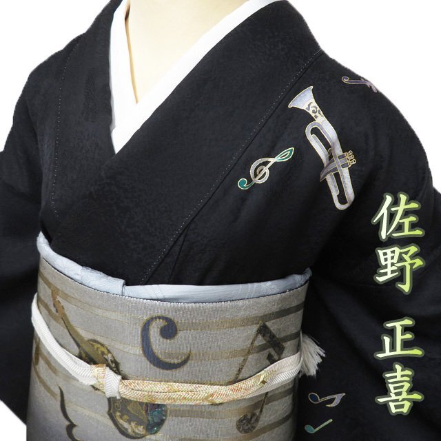 > 特選 訪問着 袋帯 2点セット 着物 中古 正絹 袷 佐野正喜 落款 楽器の図 螺鈿箔 黒色 多色 金 身丈158cm 裄63cm M きもの北條 A1231-12