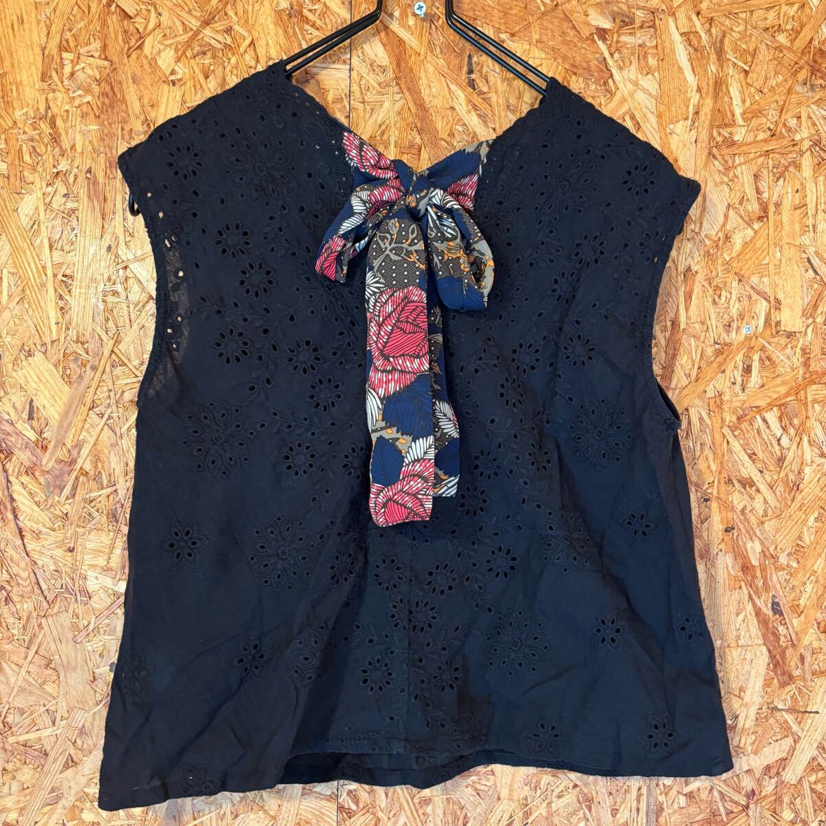 - Factor ノースリーブ カットソー 背中リボン 刺繍 ブラック トップス レディース Vネックトップス 袖なし 4685
