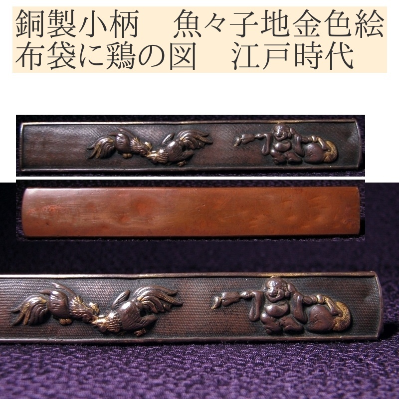 - 時代武具 小柄 赤銅魚々子地金色絵 布袋に鶏の図 桐箱付 江戸時代/25a052