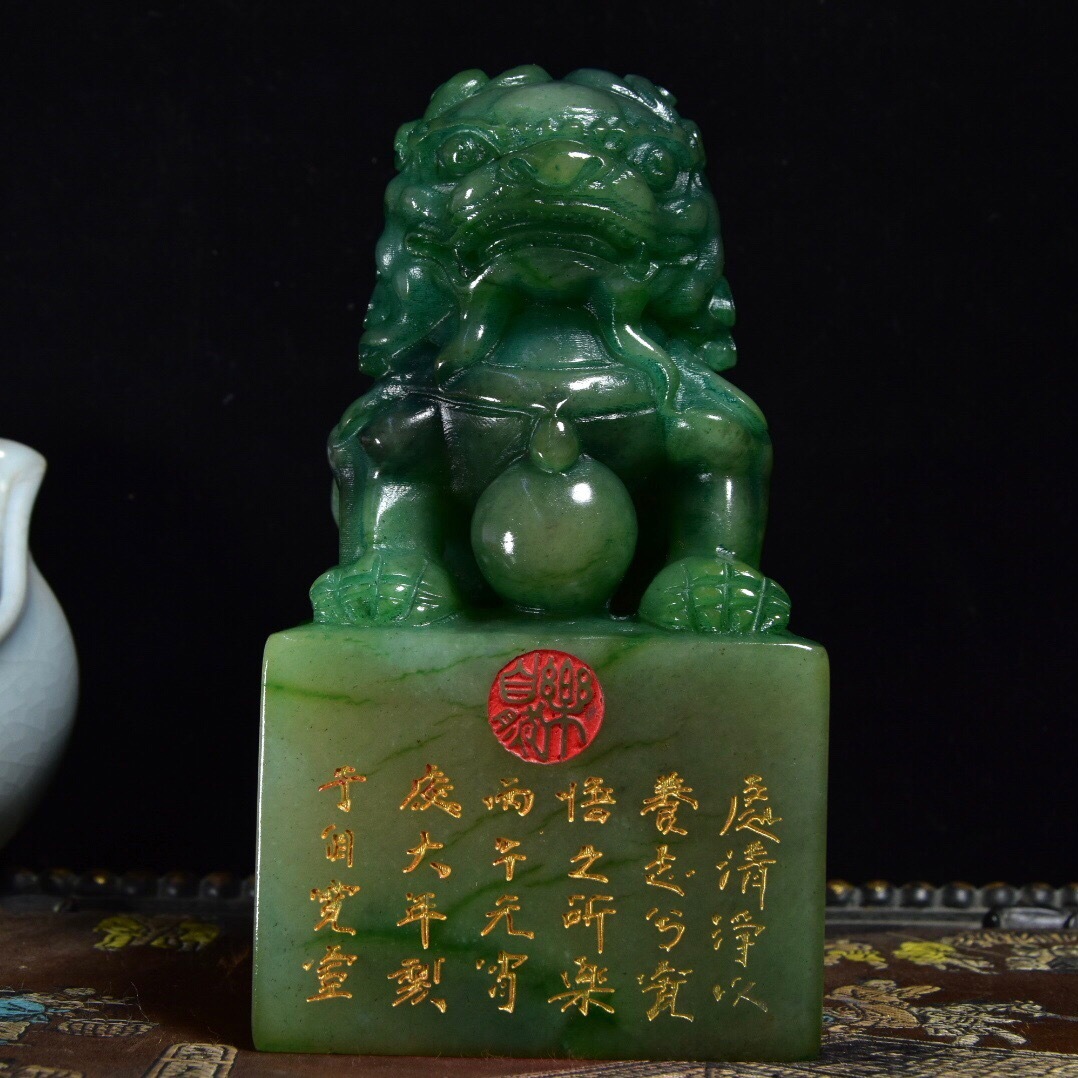 - 蔵友旧蔵出 寿山石 綠田黄石 細密彫 描金 獅子印章 箱付 貴重品 稀少物品 置物 賞物 中国時代美術品