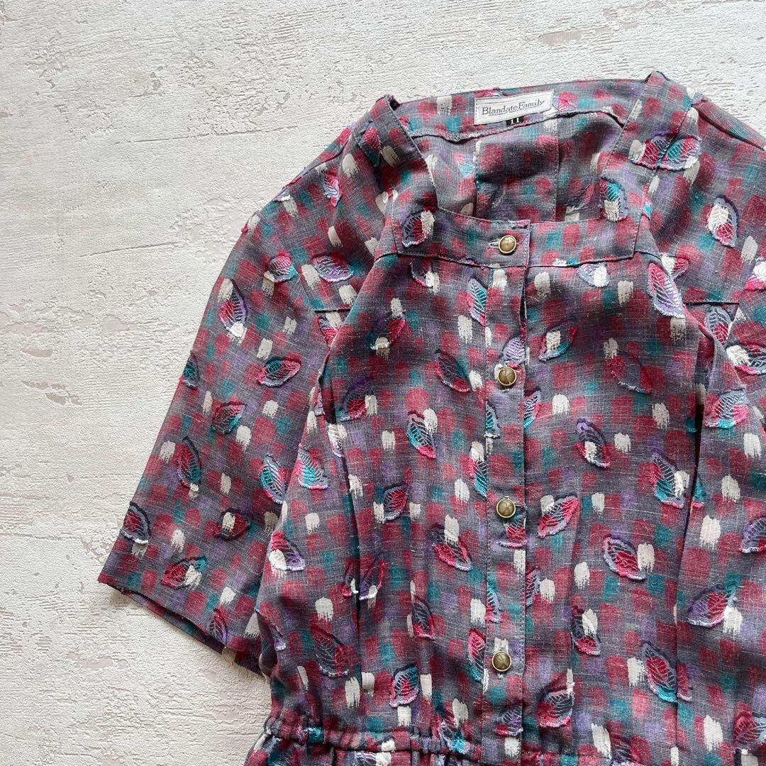 - 昭和レトロリーフ柄刺繍入り半袖ロングワンピース渋かわ透け素材グレー11号n1