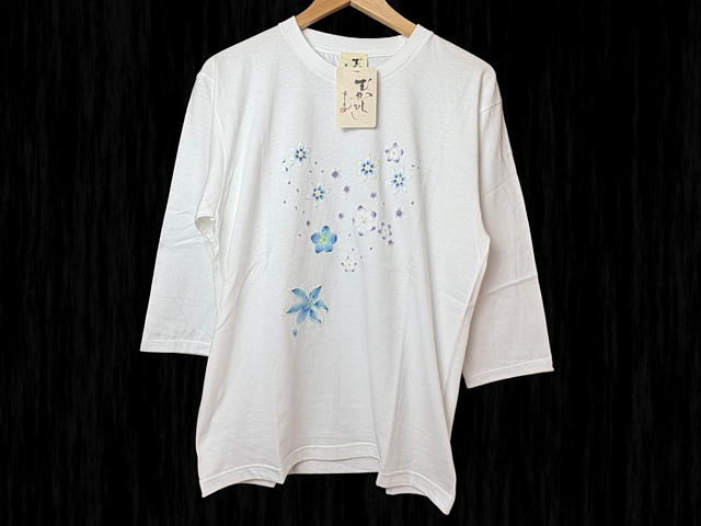 - №3 白 Lサイズ むかしむかし 七分袖Tシャツ 日本製 綿100% 立体プリント 花柄