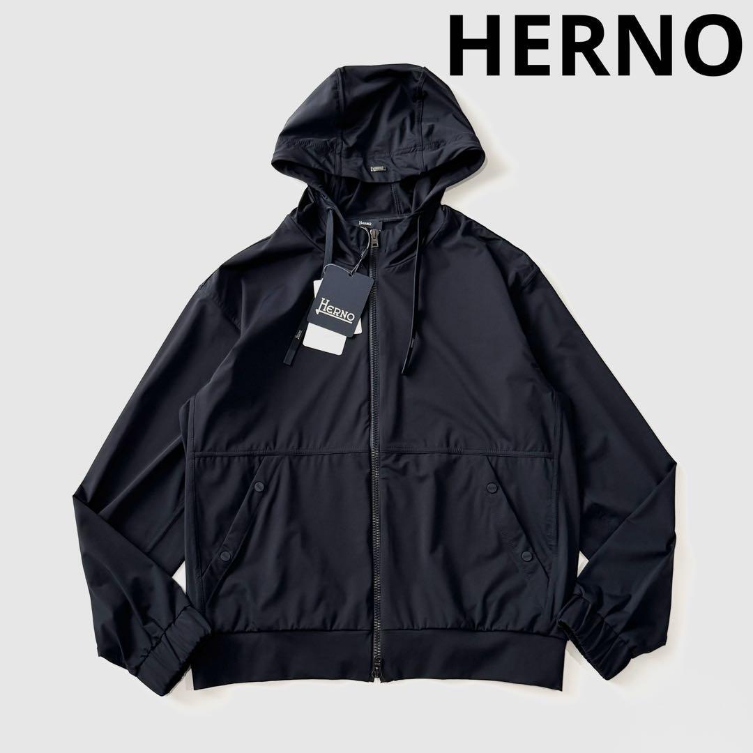 > 【未使用】HERNO ヘルノ ストレッチ ナイロン ジャージー ジップ パーカー 46 ネイビー 紺 ダブルジップ ロゴ フーディー 長袖 国内正規