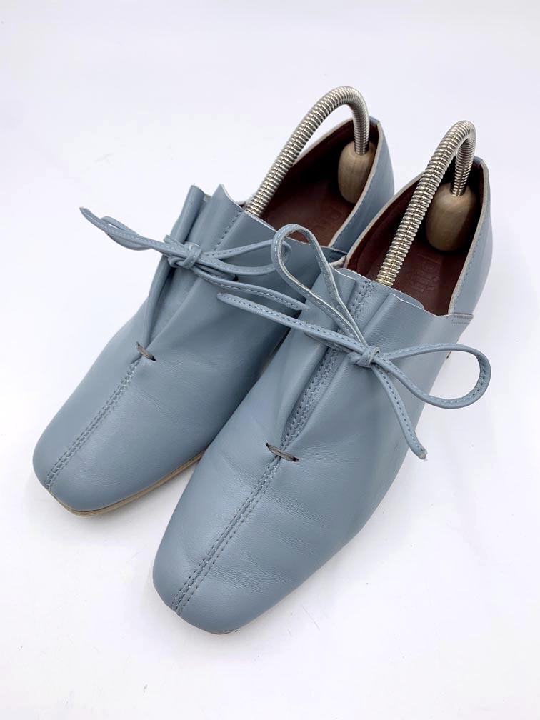 - piu comoda ピュコモダ 定価17930円 フリルフラット シューズ size37/水色 ■■