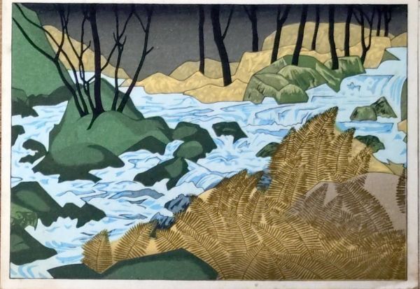- f25071025〇彩色木版画 ハガキサイズ渓谷 グリーティングカード 錦絵 浮世絵 昭和年代〇和本古書古文書