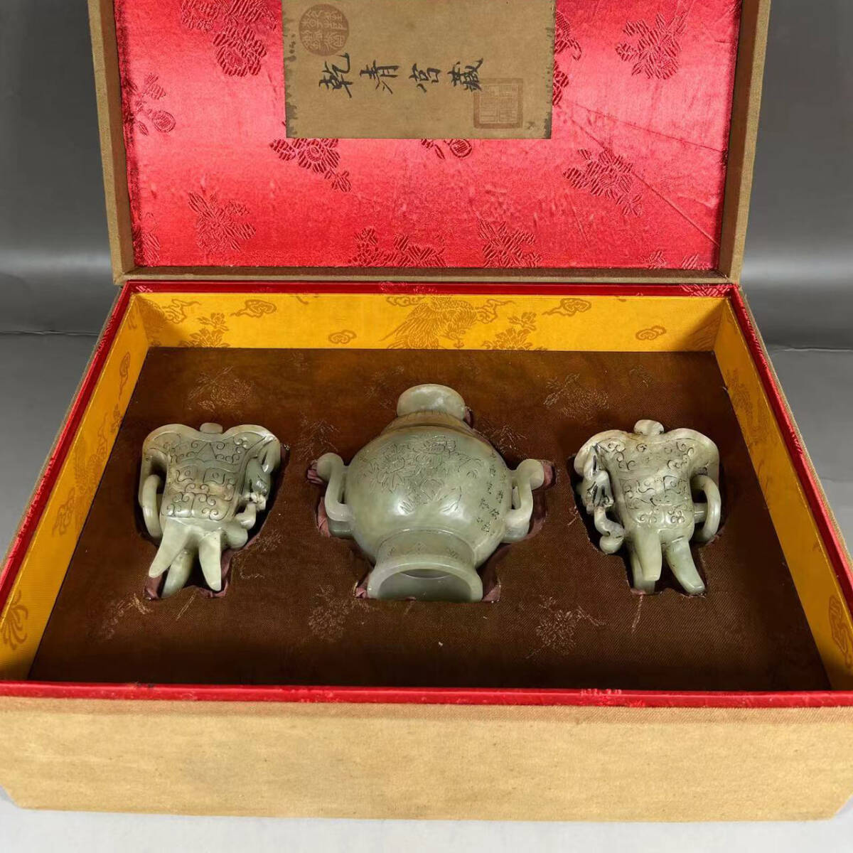 > 7+DS2835「東洋美術」 人間国宝 和田玉 極細工 古置物 中国古美術 【和田玉の香炉と水差しの箱】 旧物 珍品 収蔵価値が高い