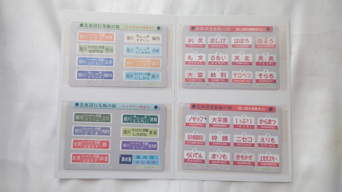 - ▲JR北海道▲北海道行先板の旅マイタウン列車1.2/思い出の愛称名1.2▲記念オレンジカード1穴使用済み4枚組台紙付