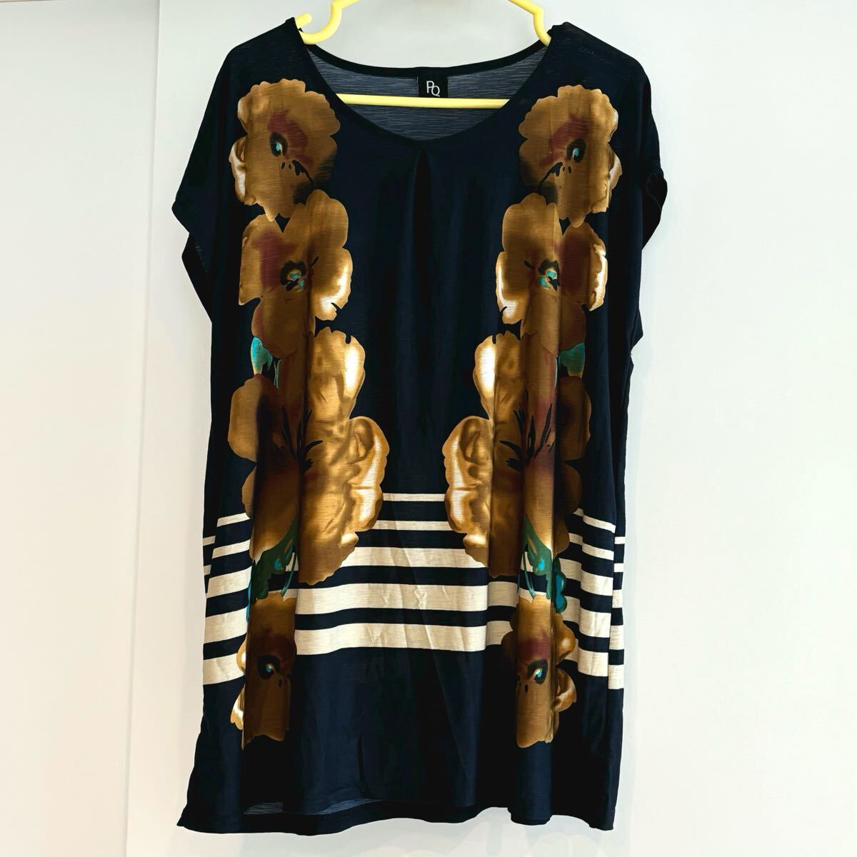 - 花柄ボーダー ネイビー薄手半袖ワンピースチュニック 紺色 黄色フラワー 半袖チュニックワンピース
