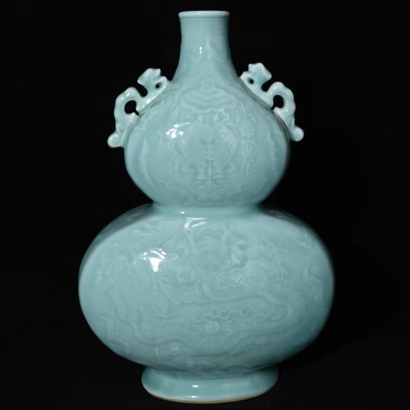 - 磁器 花瓶 秘藏 大清乾隆年制 天青釉彫刻竜紋瓢箪扁瓶 酒器 茶器 唐磁 染付 陶磁器 收蔵品 古美味 時代物 古美術古置物 珍品 中國文玩7.14