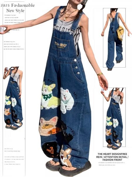 - オーバーオール ズボン S~2XLまで選べる デニム生地 ジーンズ オシャレ プリント犬柄 楽ちん 可愛デザイン ゆったり