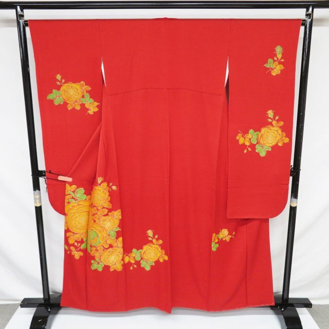 - 振袖 着物 中古 成人式 結婚式 結納 花模様 薔薇 赤色 多色 金 身丈159.5cm 裄66cm M きもの北條 A1237-1