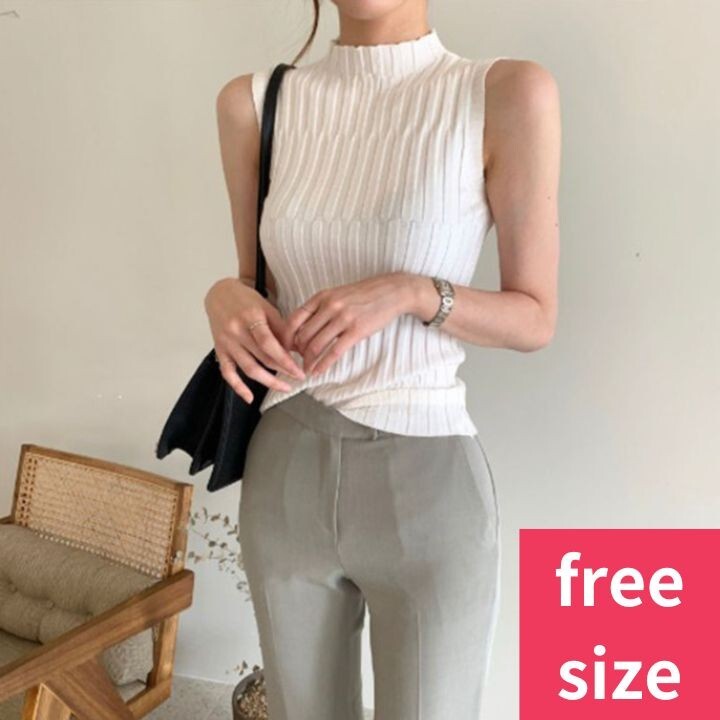 - ノースリーブ タンクトップ 綺麗め プチハイネック サマーニット リブニット 白