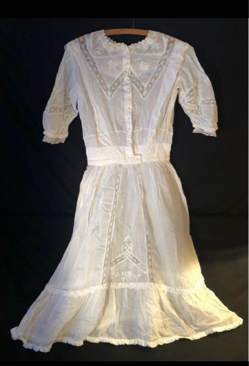 - アンティーク ヴィクトリアン レースワンピース 半袖 刺繍 ホワイト系 フランス ヨーロッパヴィンテージ