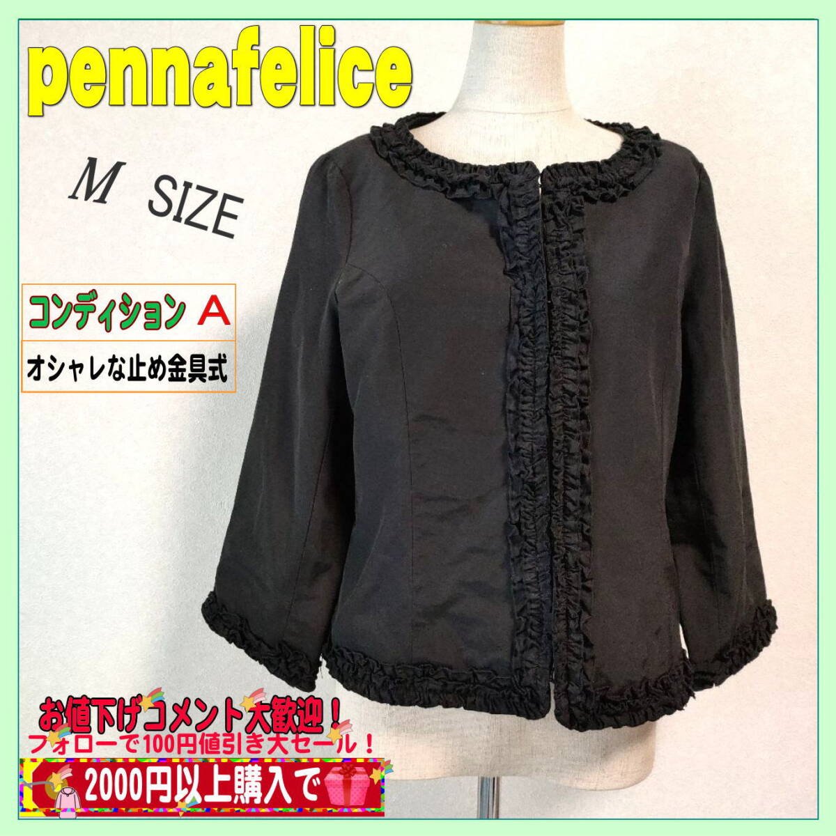 > 美品 pennafeliceレディースジャケット黒色(表記9号)Mサイズ相当 ブラック 送料無料 匿名配送 毛玉が付きにくい!
