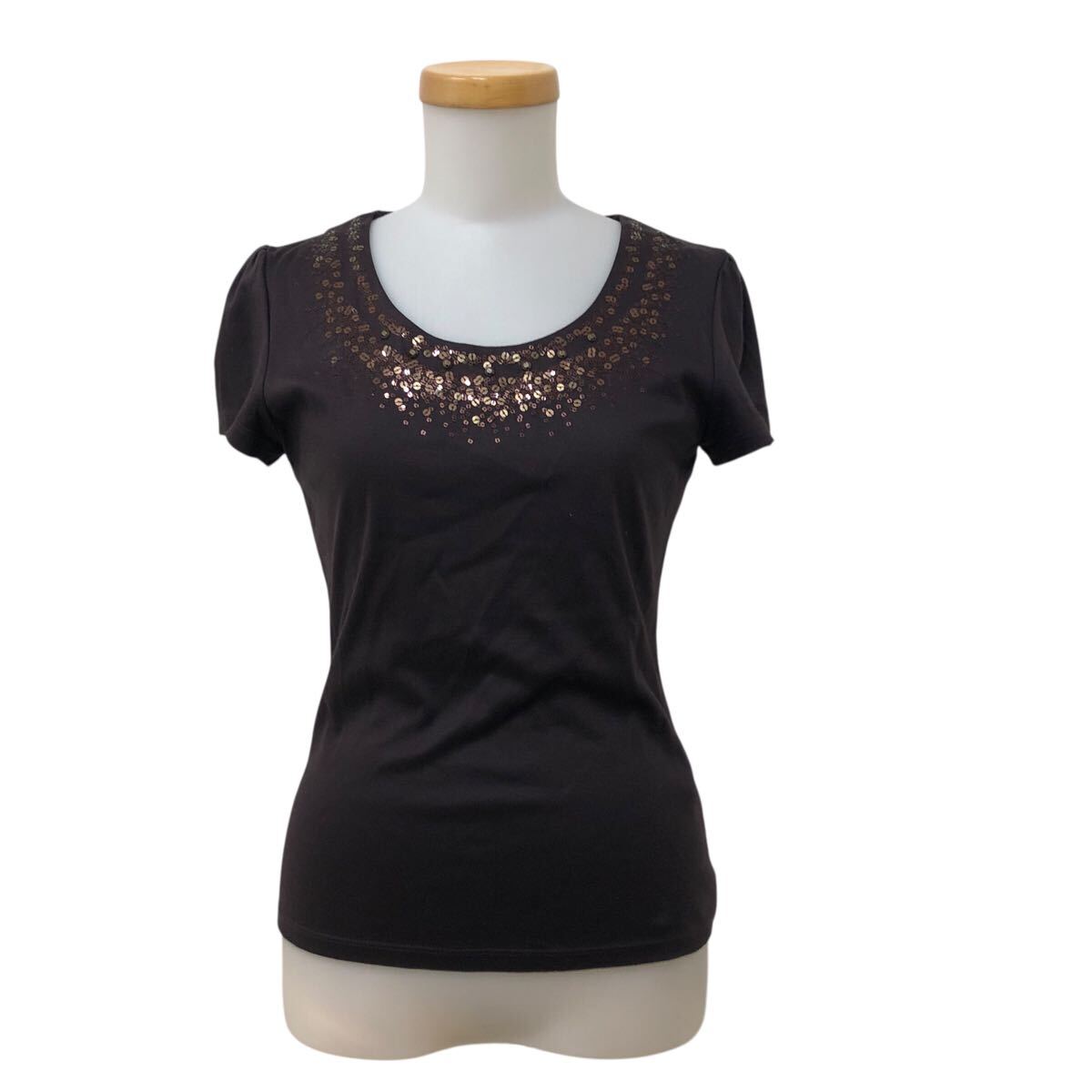 - C427-17 ANAYI アナイ フリル 半袖 Tシャツ スパンコール ティシャツ トップス カットソー レディース 38 ブラウン 茶 日本製