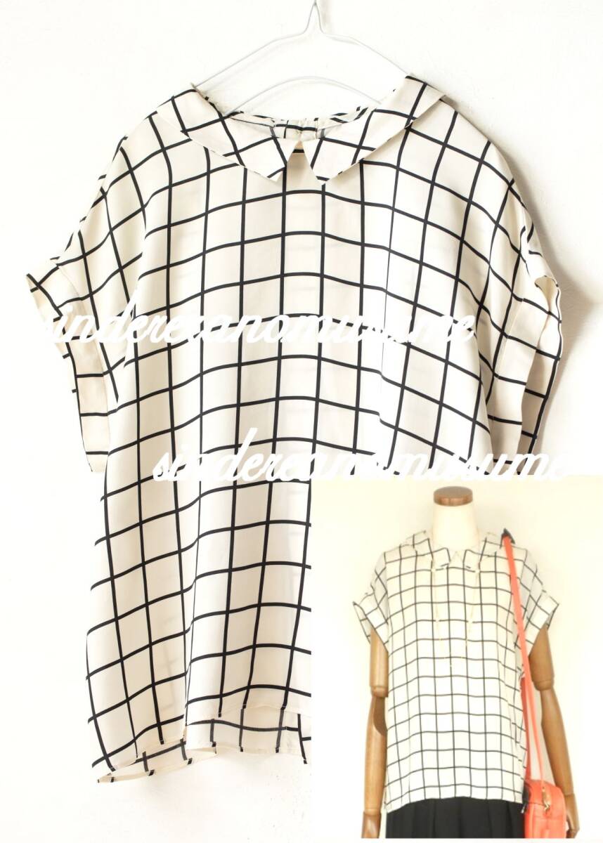 - ★エリオポール 白黒チェック半袖ブラウス 格子柄 ライロベージュ★