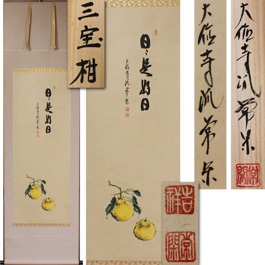 - 《源》【即決・送料無料】大徳寺 辻常閑 筆 茶掛一行書「日々是好日」三宝柑 図/共箱付(7万円也)