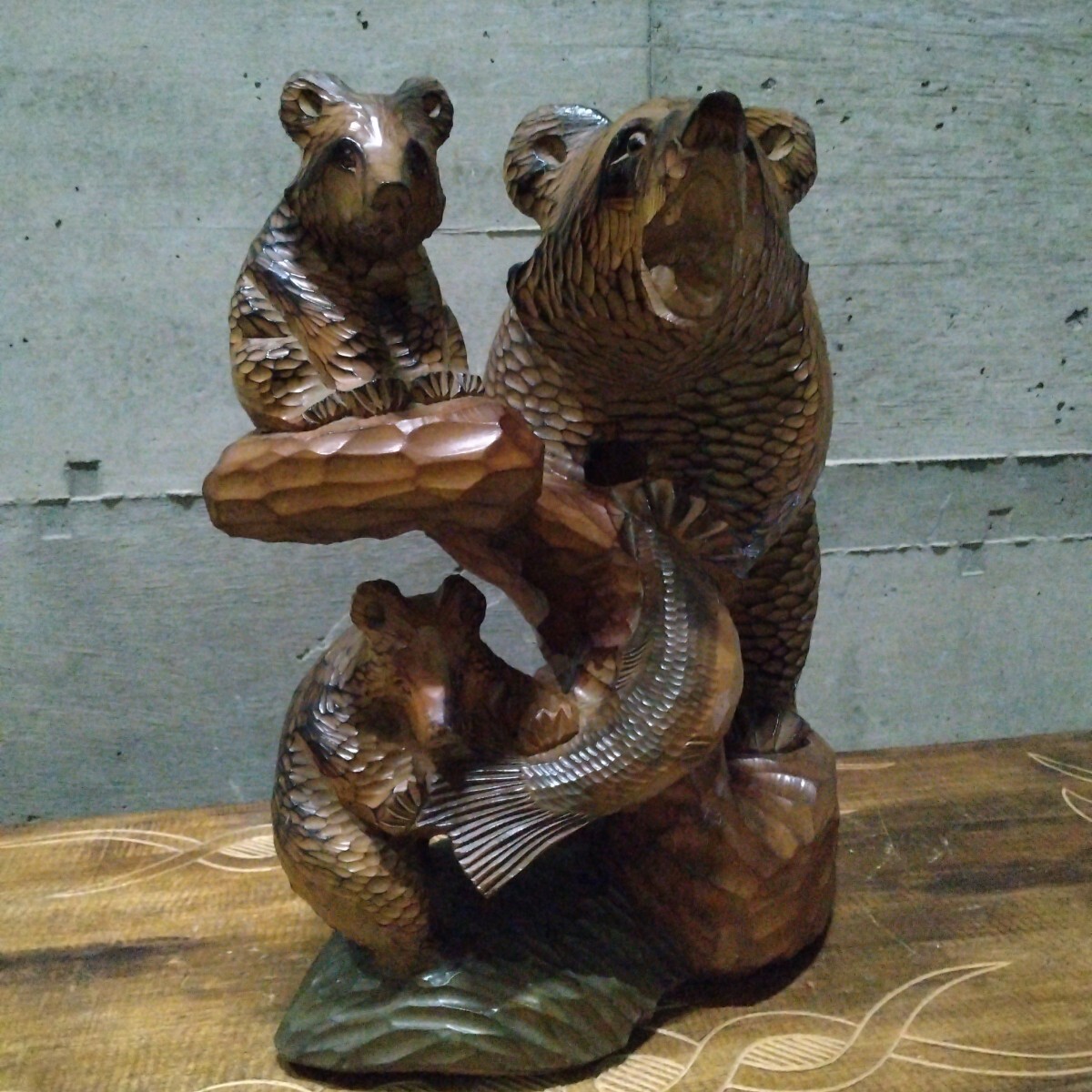 - 高さ41cm 木彫り クマ 熊 親子 鮭 置き物 北海道 民芸品 工芸品 民藝