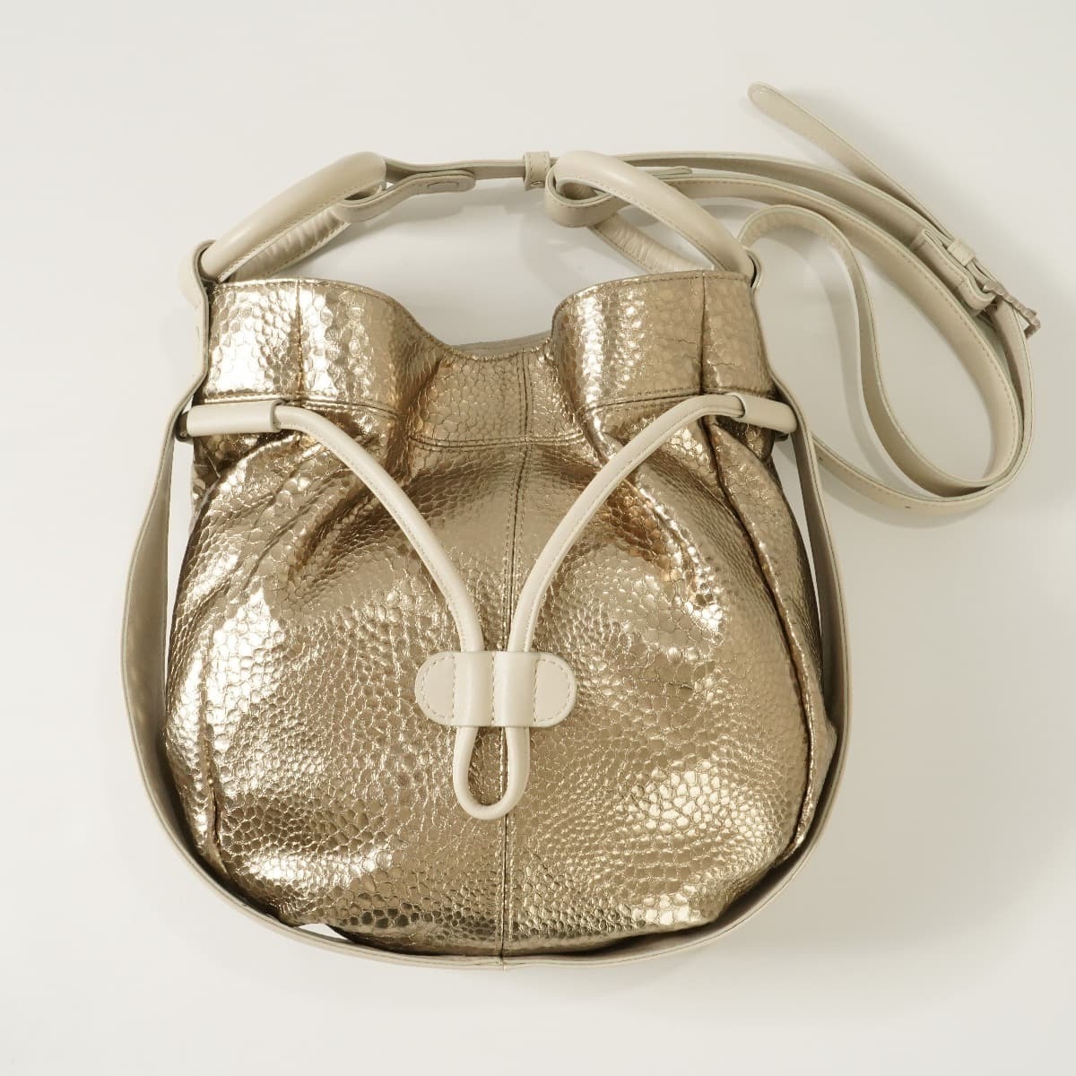 コメント:GATTOPARDO(ガトーパルド)シリーズの数量限定モデル。豪華絢爛な貴族がパーティーに持って行く様なバッグをイメージして作られた、豪華な中にも哀愁漂うデザインです。巾着のように口を絞ることで開閉をするドロスト仕様のショルダーバッグは、クロスボディでもハンドでも持てる2wayタイプ。コンパクトながら長財布やペットボトル(500ml)も収まります。素材は、軽くやわらかなやぎ革に高級感のあるパイソン柄の箔を圧着しています。使うほどにやわらかく、徐々に箔が剥がれていくことで経年変化を楽しめるアイテムです。ショルダーの長さは調節できます。