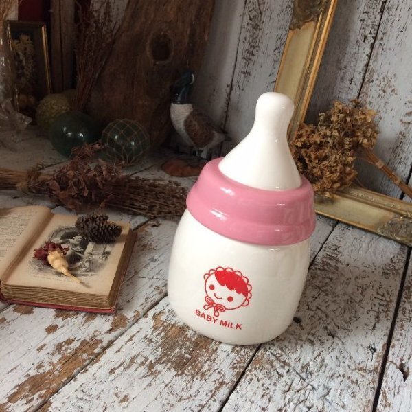 > BABY MILK 陶器製 かわいい 哺乳瓶型 キャニスター 蓋物 保存容器 小物入れ H25cm キッチン 台所 ベビー ミルク ピンク×ホワイト系