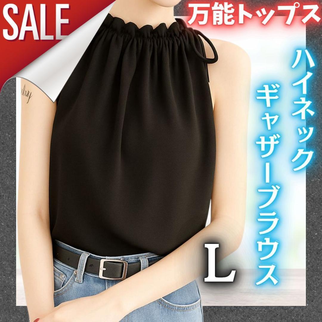 - ノースリーブ ハイネック ギャザー ブラウス L シフォン 体型カバー ブラック cc-1083-1